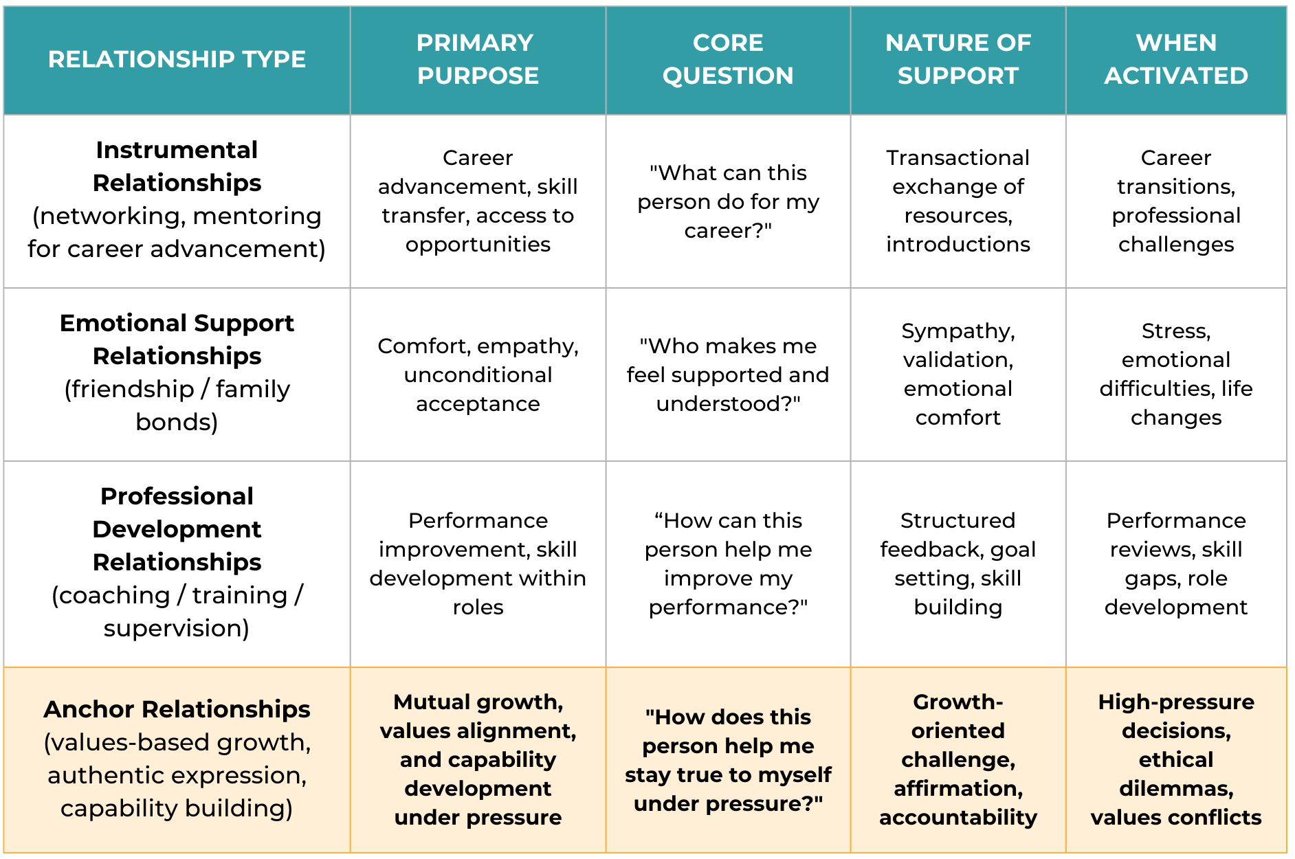 Unlike other professional relationships focused on career advancement or emotional comfort, Anchor Relationships provide the courage and clarity needed to make values-based decisions in challenging situations. This identity-based courage emerges when trusted relationships affirm our capacity to act according to deeply held values, creating the relational context that makes authentic moral action possible (Burke & Stets, 2009).